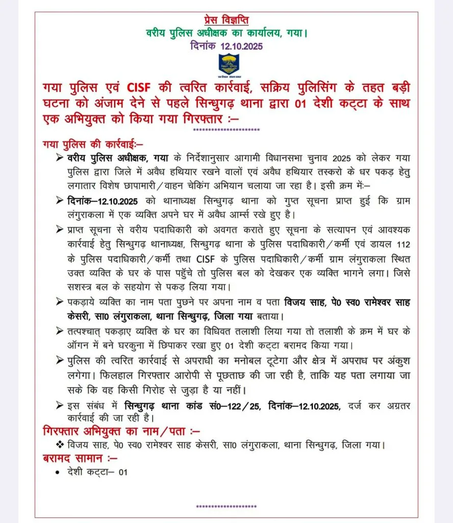 गया। बिहार के गया जिले के सिंधुगढ़ थाना क्षेत्र के लंगूरा कलां गांव में शनिवार देर रात पुलिस की एक छापेमारी ने पूरे इलाके को सोचने पर मजबूर कर दिया है। पुलिस ने गांव के निवासी विजय साव केशरी को उनके घर से एक देशी कट्टा बरामद करने का दावा करते हुए गिरफ्तार कर लिया। हालांकि, परिवार और ग्रामीणों का आरोप है कि यह कार्रवाई जल्दबाजी में की गई और इसमें साजिश की बू आ रही है। पुलिस की प्रक्रिया पर सवाल उठाते हुए ग्रामीणों ने कहा कि विजय साव एक नेक और निर्दोष व्यक्ति हैं, जिन्हें फंसाया जा रहा है। इस घटना ने आगामी विधानसभा चुनाव 2025 के मद्देनजर चल रही पुलिस की ‘सक्रिय पुलिसिंग’ पर भी सवाल खड़े कर दिए हैं।