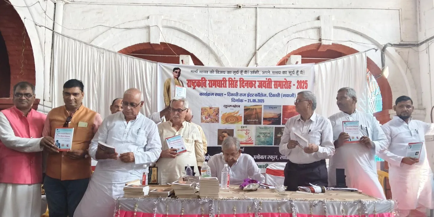 टिकारी संवाददाता: मां निर्दोष सेवा केंद्र के तत्वावधान में रविवार को टिकारी राज इंटर कालेज के सभागार में राष्ट्रकवि रामधारी सिंह दिनकर की जयंती समारोह पूर्वक मनाई गई। कार्यक्रम का शुभारंभ राष्ट्रकवि के तैलीय चित्र पर पुष्पांजलि अर्पण के साथ हुआ। जबकि कार्यक्रम का उद्घाटन पूर्व मंत्री राम जतन सिन्हा, सेवा निवृत विशेष सचिव राय मदन किशोर, आयोजक हिमांशु शेखर आदि ने संयुक्त रूप से दिप प्रजवल्लित कर किया। आगत अतिथियों का स्वागत अंग वस्त्र एवं स्मृति चिन्ह प्रदान कर किया गया। कार्यक्रम में 18 विभिन्न निजी एवं सरकारी विद्यालय के छात्र-छात्राओं ने काव्य पाठ, निबंध लेखन एवं चित्रकला प्रतियोगिता में भाग लिया।