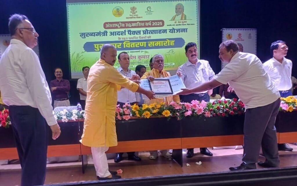 टिकारी संवाददाता: मुख्यमंत्री आदर्श पैक्स प्रोत्साहन योजना 2025-26 के अंतर्गत चयनित टिकारी के दो पैक्स अध्यक्षों को पटना में पुरस्कृत एवं सम्मानित किया गया। बीआईटी कैम्पस पटना स्थित दशरथ मांझी आडिटोरियम में गुरुवार को आयोजित पुरस्कार वितरण सह सम्मान समारोह में कार्यक्रम के मुख्य अतिथि सहकारिता मंत्री डा. प्रेम कुमार ने चयनित सभी पैक्स अध्यक्षों को चेक व प्रस्सति पत्र प्रदान कर सम्मानित किया। इसी क्रम में जिलास्तर पर द्वितीय एवं तृतीय पुरुस्कार के लिए चयनित मखदुमपुर के पैक्स अध्यक्ष शशि रंजन को 3 लाख का चेक और प्रस्सति पत्र तथा तृतीय पुरुस्कार के लिए लाव के पैक्स अध्यक्ष कृष्ण गोपाल सिंह उर्फ मंटू शर्मा को 2 लाख का चेक और प्रस्सति पत्र प्रदान कर मंत्री डा. कुमार ने सम्मानित किया। जबकि नगर प्रखंड के रसलपुर पैक्स को जिले का प्रथम पुरुस्कार प्रदान किया गया।