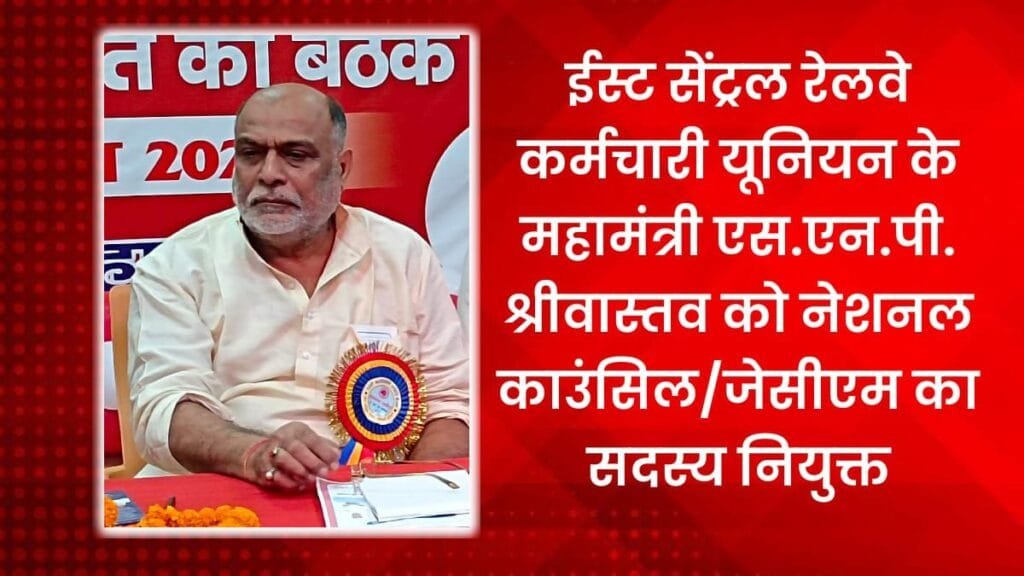 गया। ईस्ट सेंट्रल रेलवे कर्मचारी यूनियन, हाजीपुर के महामंत्री कॉमरेड एस.एन.पी. श्रीवास्तव को रेल मंत्रालय ने नेशनल काउंसिल/जेसीएम (स्टाफ साइड) का सदस्य नियुक्त किया है। यह नियुक्ति पूर्व मध्य रेलवे के कर्मचारियों के लिए महत्वपूर्ण उपलब्धि मानी जा रही है, वहीं यूनियन के हाजीपुर जोन और गया शाखा में खुशी की लहर है।