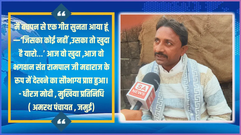 इस मौके पर गांव के मुखिया प्रतिनिधि धीरज मोदी ने भावुक होते हुए कहा – “मैं बचपन से एक गीत सुनता आया हूं—‘जिसका कोई नहीं ,उसका तो खुदा है यारो…’ आज वो खुदा ,आज वो भगवान संत रामपाल जी महाराज के रूप में देखने का सौभाग्य प्राप्त हुआ। आज तक मैने ऐसे सेवा कार्य अपने जीवन में नहीं देखा जो सेवा कार्य संत रामपाल जी महाराज जी कार्य कर रहे है। उन्होंने कहा कि मैं भारत के अन्य संतों से अपील करता हूं कि वे संत रामपाल जी महाराज से सिख ले की कैसे एक संत सेवा कार्य कर रहे है। ताकि वे सब भी मानवता के पथ पर चले और बेबस और लाचार परिवारों को मदद कर सके।